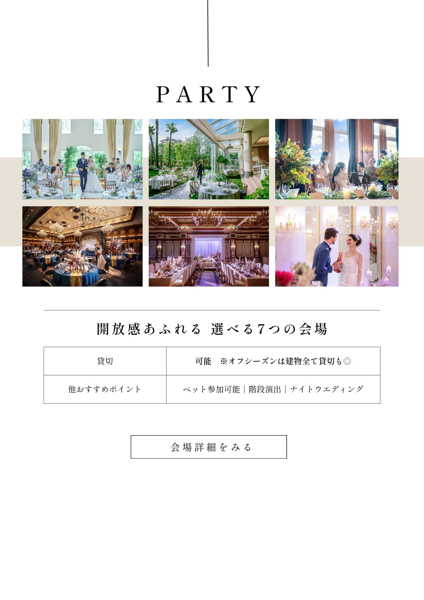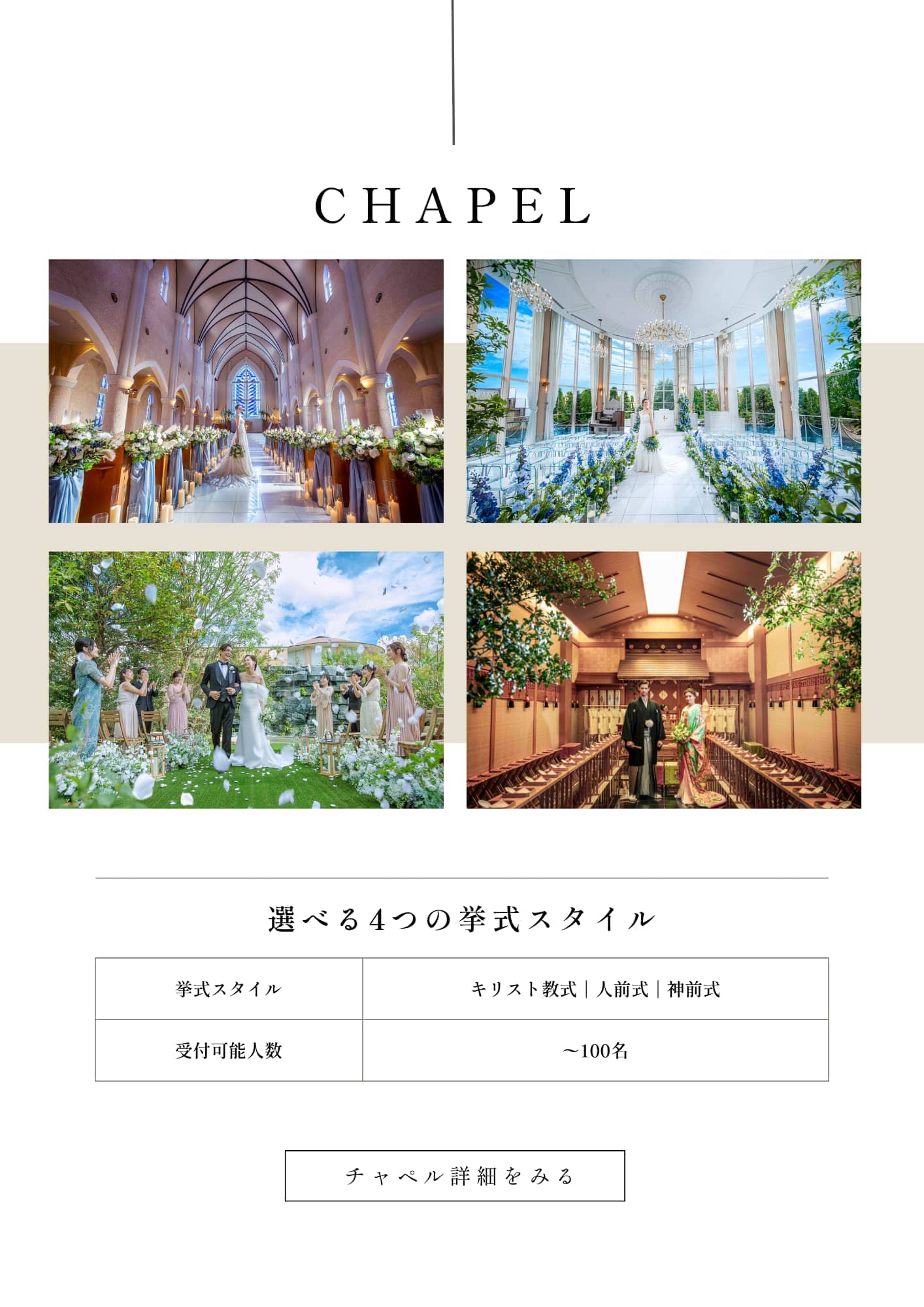 広大な敷地に佇む様々な挙式スタイルに、7つの個性異なるパーティー会場がそろう空間必ず理想が見つかる、選べる豊富な選択肢